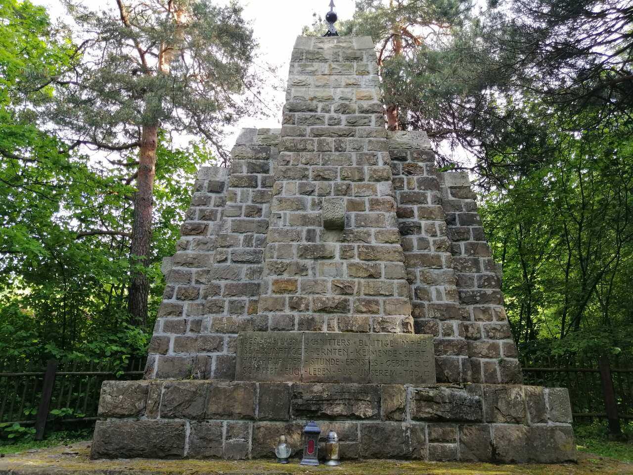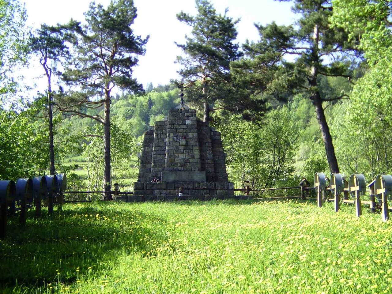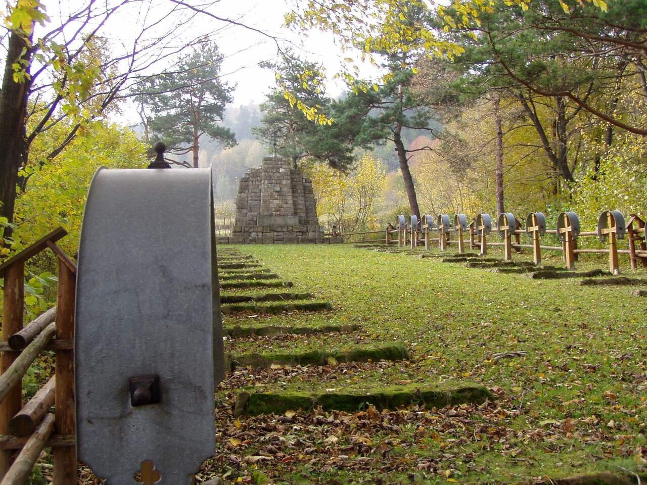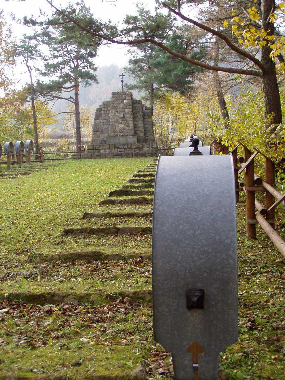 Element centralny cmentarza stanowi wysoki kamienny pomnik w kształcie ściętego ostrosłupa o podstawie prostokątnej z podwójnymi przyporami bocznymi o malejącej wysokości. Przypory skrajne posiadają boczne konsole. Pomnik i przypory posiadają dwuspadową koronę a całość zwieńczona jest żelaznym krzyżem maltański z łuskową kulą u podstawy. Pomnik spoczywa na dwustopniowej podstawie z dużych regularnych łomów kamienia. Na frontowej ścianie płyta z inskrypcją po tłumaczeniu:
