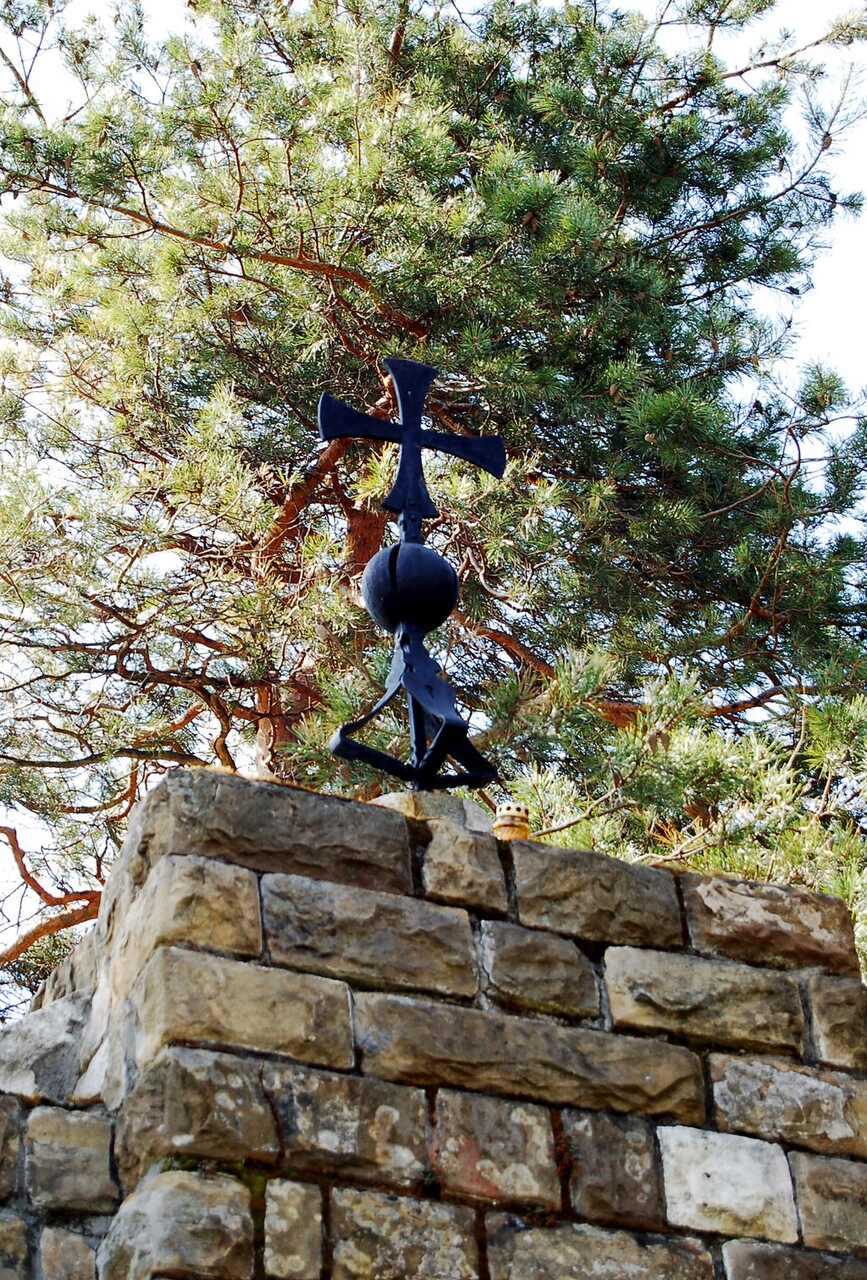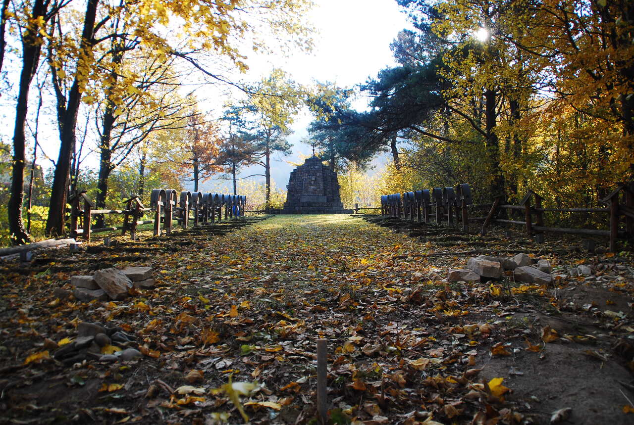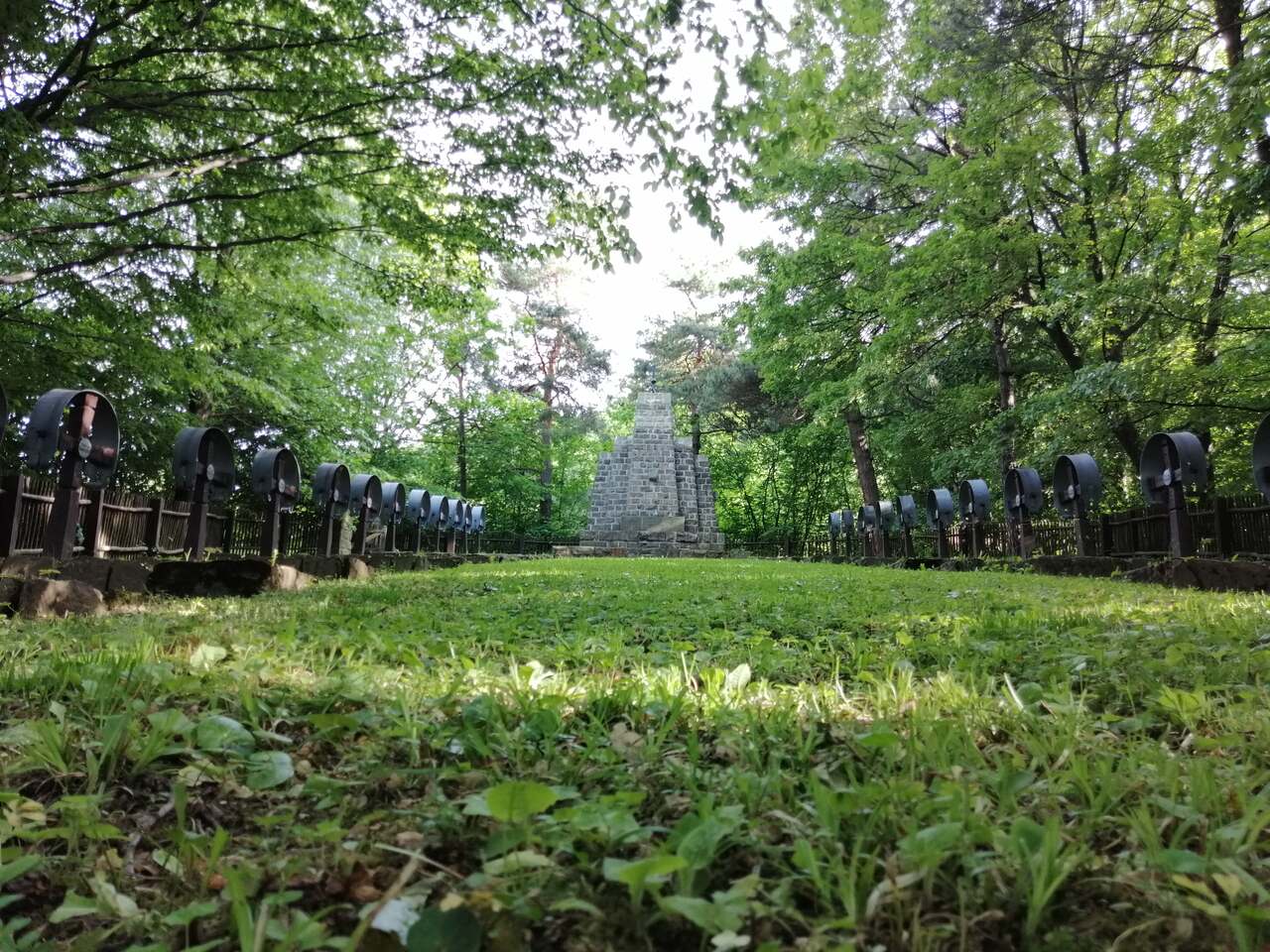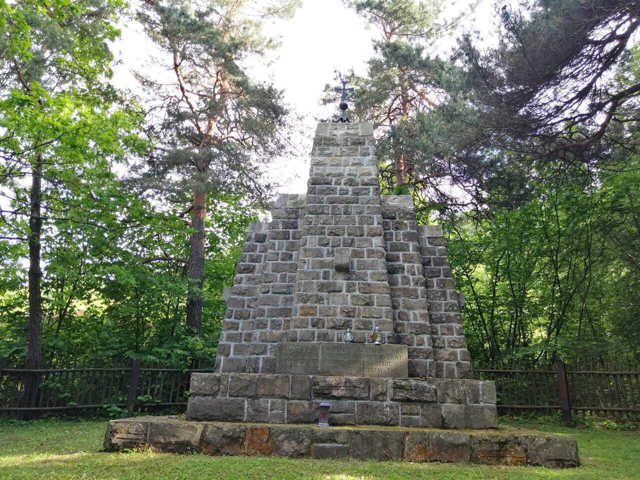 Element centralny cmentarza stanowi wysoki kamienny pomnik w kształcie ściętego ostrosłupa o podstawie prostokątnej z podwójnymi przyporami bocznymi o malejącej wysokości. Przypory skrajne posiadają boczne konsole. Pomnik i przypory posiadają dwuspadową koronę a całość zwieńczona jest żelaznym krzyżem maltański z łuskową kulą u podstawy. Pomnik spoczywa na dwustopniowej podstawie z dużych regularnych łomów kamienia. Na frontowej ścianie płyta z inskrypcją po tłumaczeniu: