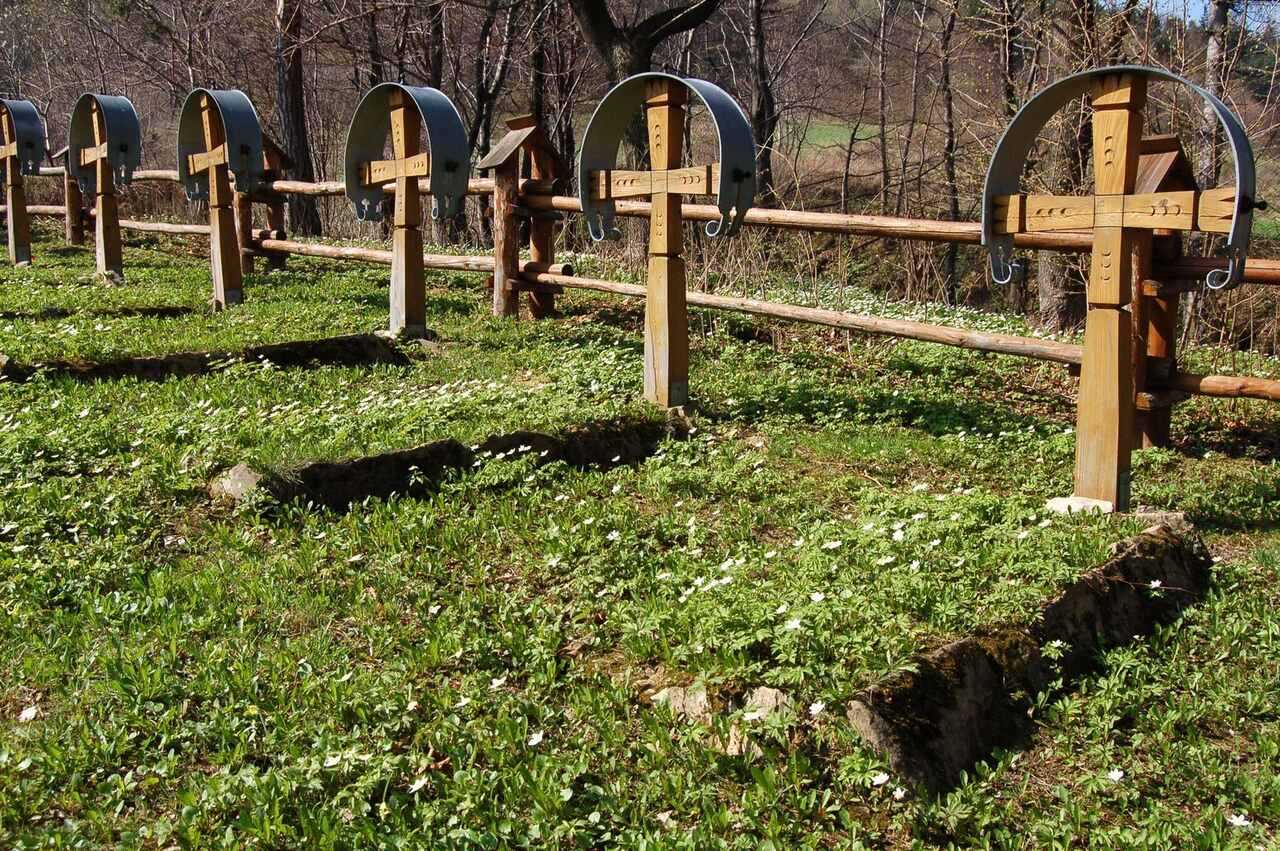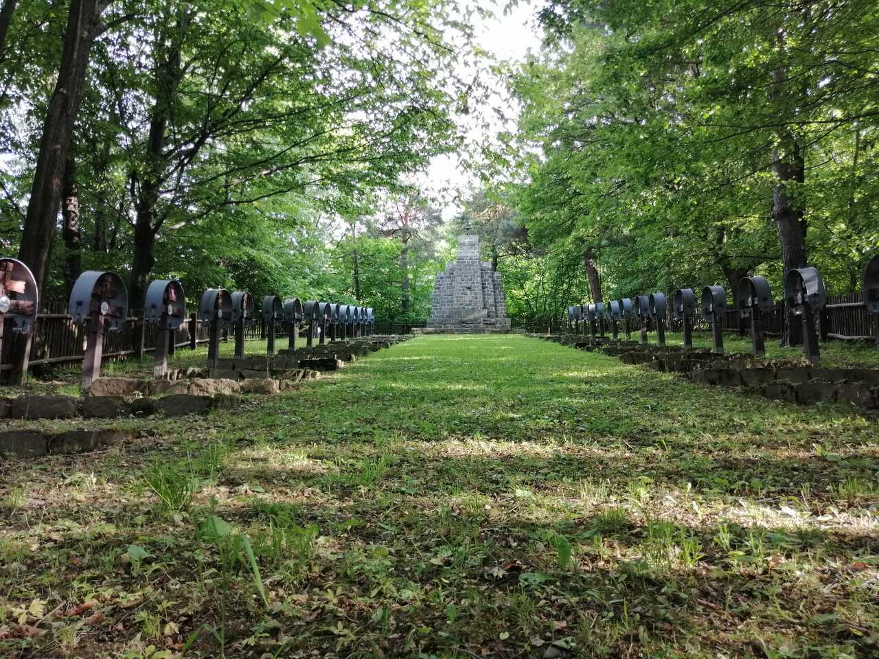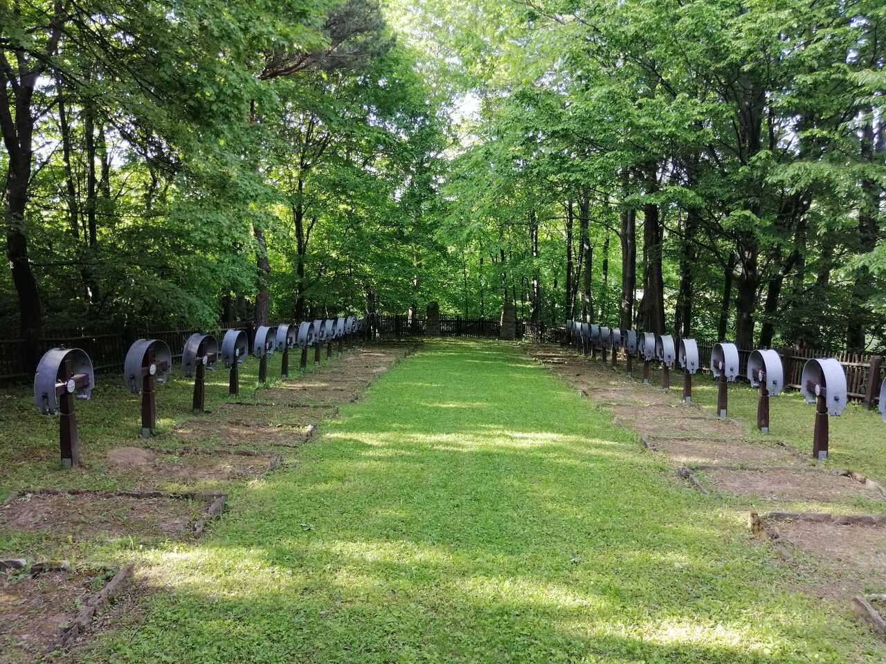 Mogiły umieszczone w dwu równoległych szeregach wzdłuż głównej alejki wiodącej od wejścia północnego ku pomnikowi. Drewniane krzyże nagrobne, nakryte blaszanym daszkiem.